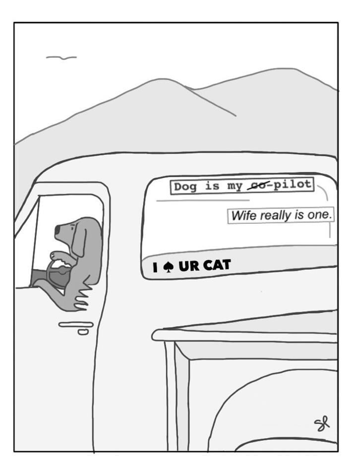 The anthropomorphized hound in his old pickup, arm resting casually out the window, was a nod to a posture reserved for a balmy Oregon summer day. The three bumper stickers drew on three familiar themes of the time. The alteration of a national message encouraging people to “spay your dog/cat” to prevent unwanted animals fit perfectly with how a redneck dog might both ridicule and redirect with his violent tendencies. The spin on the once-common “God is my co-pilot” sticker may feel sacrilegious for a stereotypical redneck, but not in my neck of the woods. And finally, the G-rated message about his wife being a literal bitch landed squarely in the sweet spot of stereotype, a label worn proudly by many local women of my youth.
