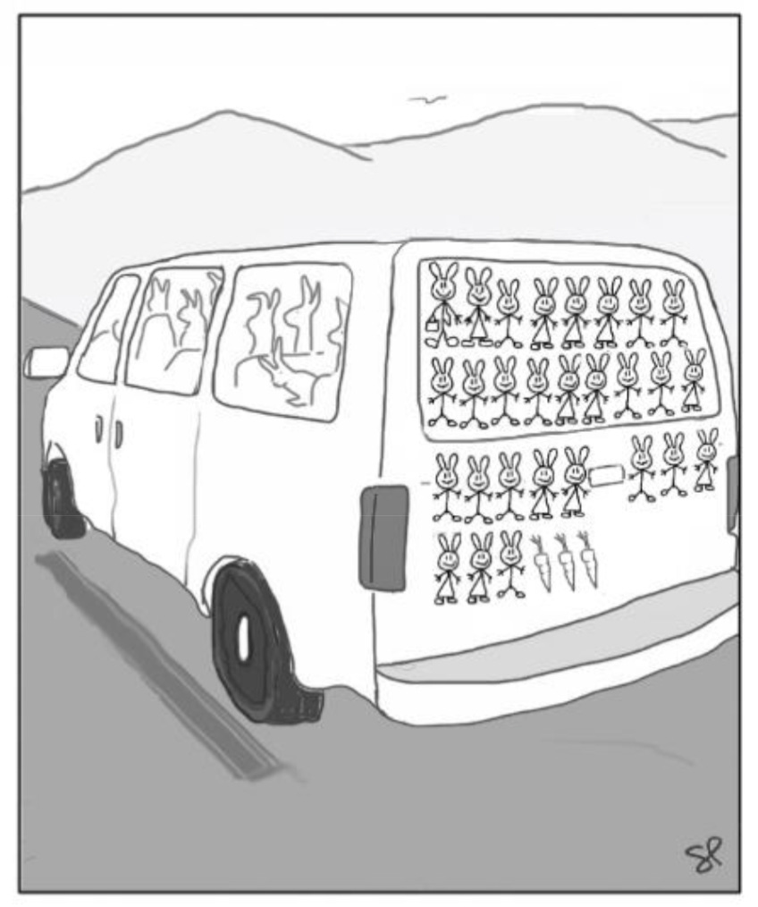I’ve always found it fascinating when people signal their nuclear family, along with pets, on the back of their vehicles. I still haven’t figured out where those stickers are actually purchased. In any case, the rabbit’s propensity for large litters seemed like the most fitting anthropomorphic translation. Sometime later, I came across a meme featuring a car covered in such stickers with the caption, “OMG, get off her!” I found that meme was far funnier than where this cartoon landed.